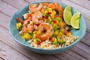 Shrimp Coconut Cauliflower Rice Bowl with Mango Salsa